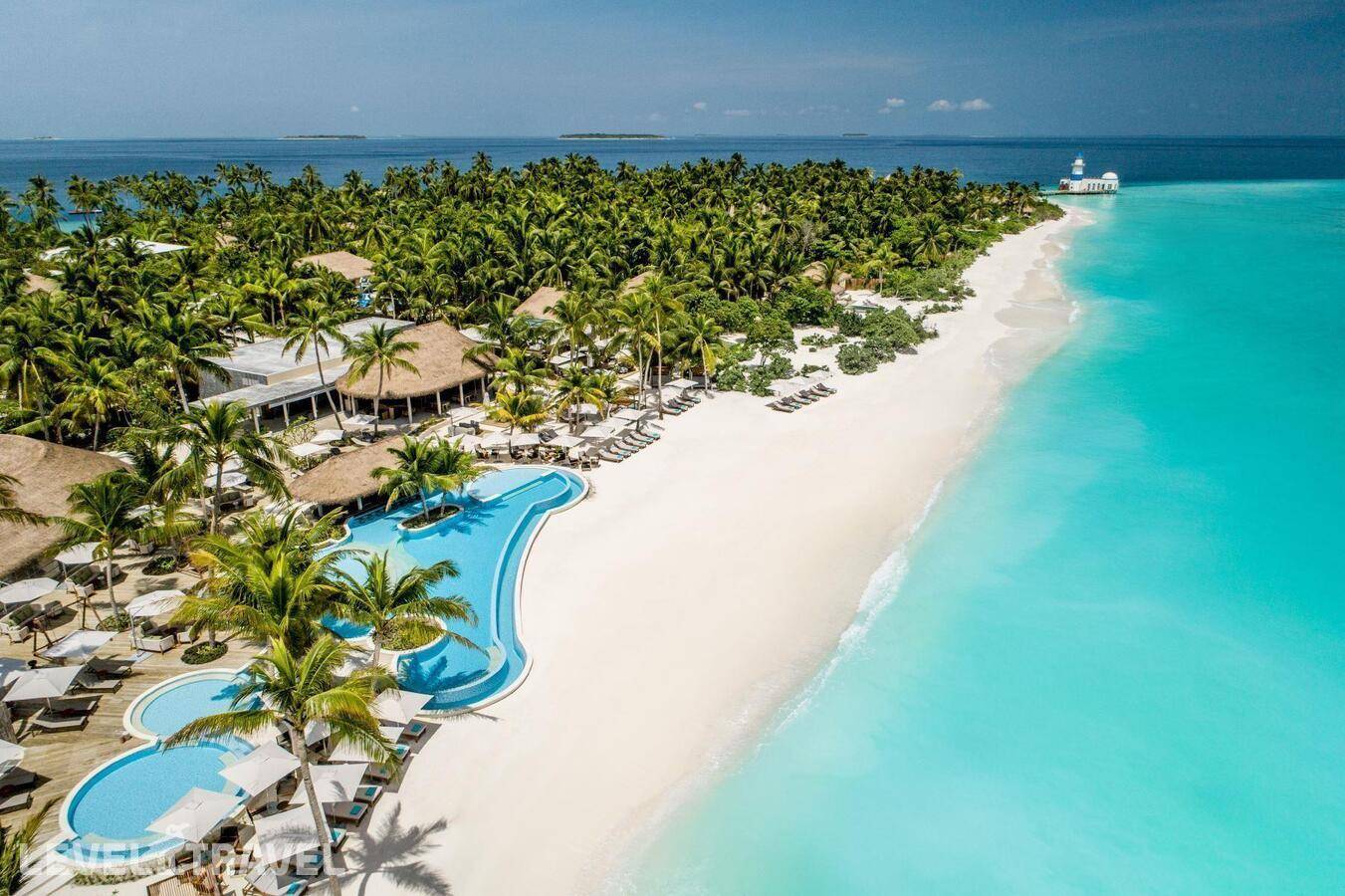The InterContinental Maldives Maamunagau Resort is located on its own island in the Raa Atoll, one of the unspoiled corners of the Maldives, renowned for its manta rays and abundant marine life. The hotel offers spacious beach and overwater villas with elegant design and private pools. Guests can enjoy six unique restaurants and bars, including the seafood restaurant Fish Market, the Mediterranean restaurant The Lighthouse, and a bar with panoramic ocean views. The renowned AVI Spa offers holistic programs inspired by nature, and the Planet Trekkers kids’ club provides exciting activities for young travelers. We recommend this resort for those seeking harmony between luxury, privacy and unity with nature.