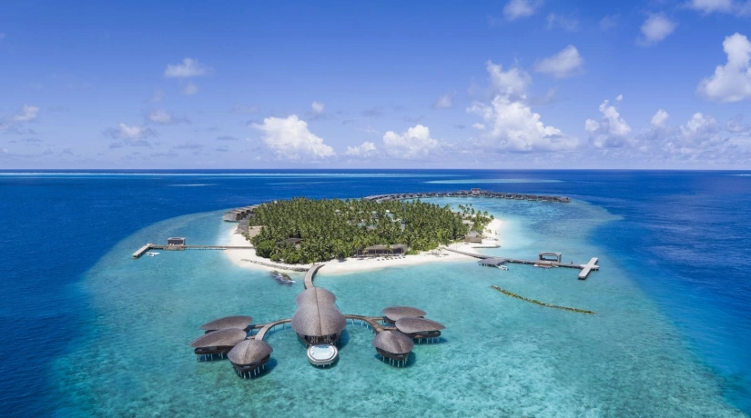The St. Regis Maldives Vommuli Resort offers the ultimate romantic getaway, featuring secluded villas with private pools, impeccable personal butler service (St. Regis Butler Service), unique architecture, and fine dining. The resort combines tropical nature, privacy, and luxury, creating a perfect setting for couples.